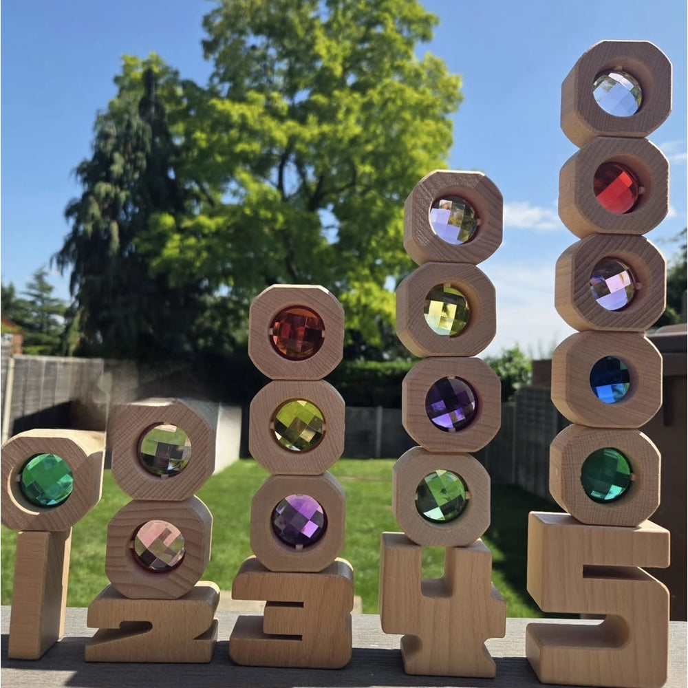 25 pieces of colourful rainbow treasure, encased in smooth, tactile, wooden outers. KCS Rainbow Gem Coins is perfect for stacking and incorporating in to exciting builds as colourful blocks or windows, perhaps replicating the beautiful features of buildings from around the world, or a design from their colourful imagination. Children can hold them up to their eyes and view the world in different colours or play with them and stack them on the light panel, noticing the effects as they explore. Explore mathematical opportunites within counting, sorting, colour recognition and perhaps create tens frames or subitising representations. Unlock a world of colourful imagination and learning opportunities with this intriguing colourful resource. Includes 25 gem coins in 5 different colours and one wooden storage tray.